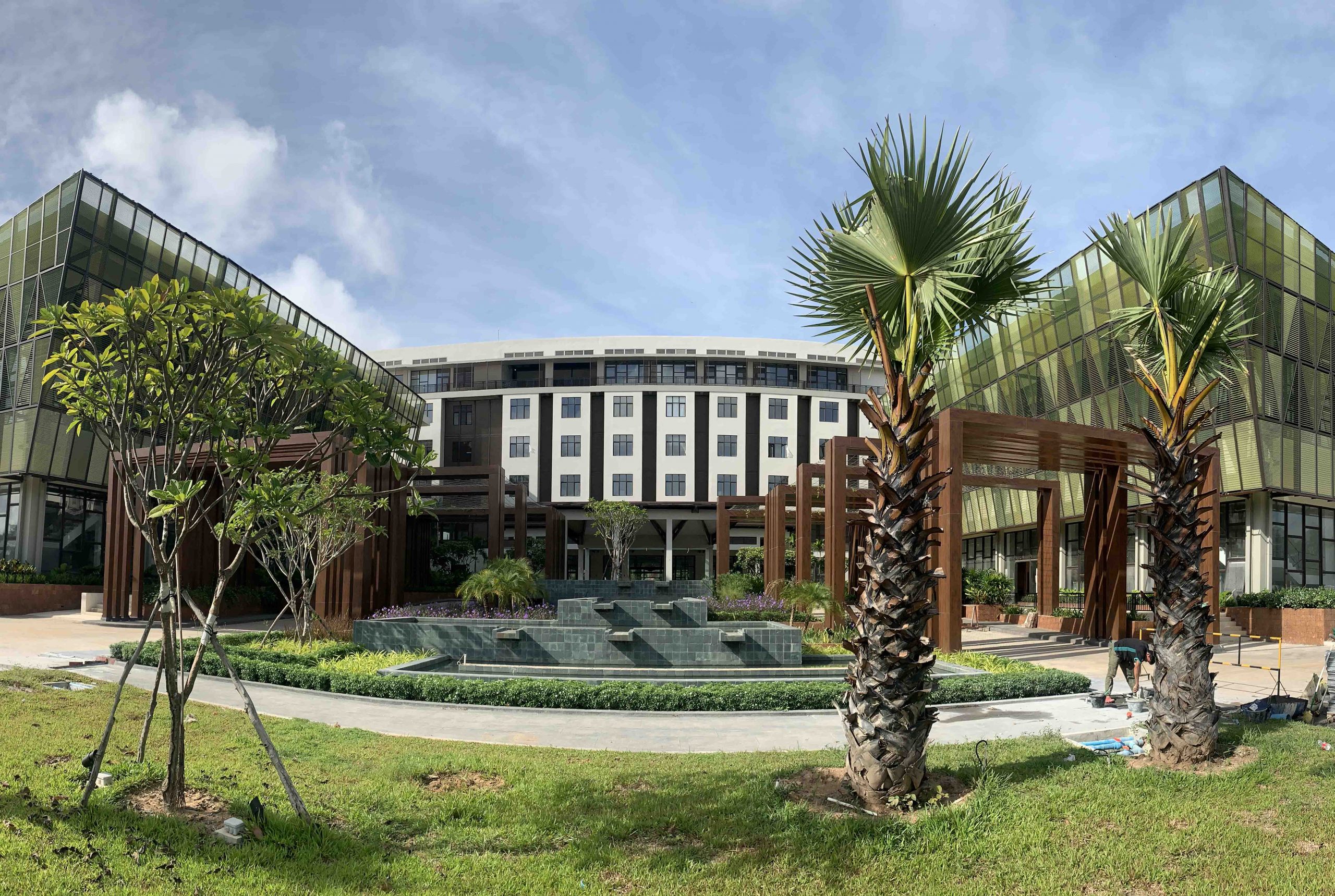 T3 ARCHITECTS designed the full Interior Design as well as all Facades of ANGSANA Siem Reap (159 Keys) Resort & Spa, following the Standards of BANYAN TREE Group for their 4* brand ANGSANA. Of course, T3 encouraged the Client to design a Bioclimatic Building, having lobby, opened-corridors and roof-top naturally ventilated, as to save a huge amount of energy (reduce AC) and bringing at the same occasion the tropical feeling all around the Property composed by 140 rooms (Deluxe, End-Suite, Pool Suite), 13 Villas (Modern Villas, Pool Villas and Traditional Villas), 1 Spa, 1 all-day dining restaurant, 1 fine dining restaurant (Saffron Thai restaurant from Banyan Tree), 2 lounges/bars, 1 Conference room, 1 Ballroom and a huge wonderful Tropical Garden designed by our Partner landscaper LJ-Asia Group. The color palette defined by T3 is composed by natural tones: brown (wood), grey (stone), white (stucco), green (plants) with some touch of light green (fresh nature) and orange (traditional Khmer fabric). T3 also bring some Khmer culture elements (Apsara, wood carving, painting, fish cages, etc.) but keeping a good balance between tradition and modernity… Dana Langlois, Art Director of the project, in collaboration with T3, set-up one of the largest “private collection” of contemporary Khmer art which is one of the very interesting part of the overall Resort Concept. Facades have been designed by T3 Team with the support of ACYC, as to create a double-ventilated and decorative facades, bringing shadow and rhythm, it means comfort and vibrancy.