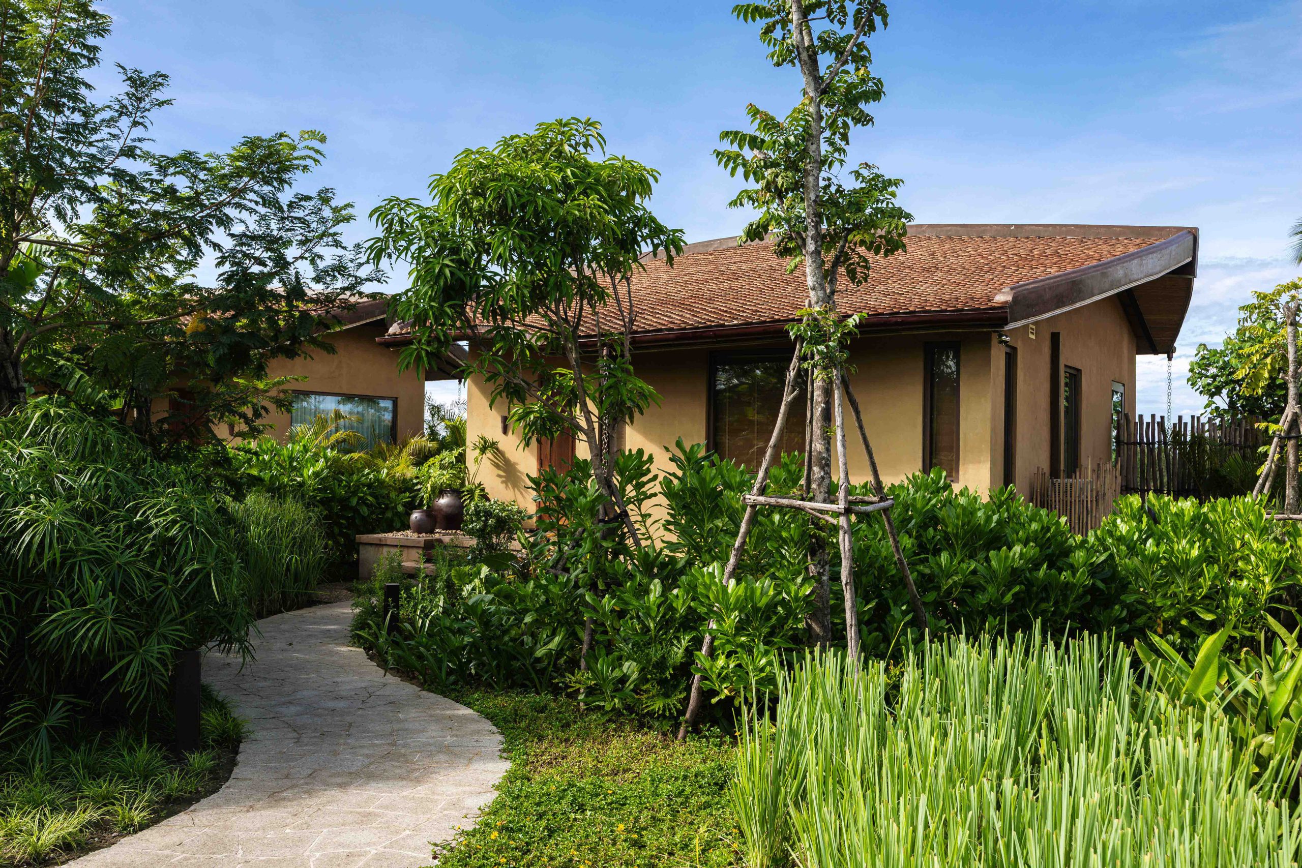 T3 ARCHITECTS Team designed Namia River Retreat as a true sustainable ultra luxury Resort; starting by the Site analysis to optimize the design and ensure a low carbon footprint approach, T3 decided first to preserve the natural river banks which have been reinforced by our friend Dao Ngo with bamboo sticks and mangroves which help to stabilize the natural soil without using concrete or heavy infrastructure. Then, T3 and LJ-Group (Landscaper) focused on the Master Plan, with the main intention to maintain the natural soil (by having most of the buildings on stilts), conserve the existing trees and native plants as part of the “sanctuary” concept, design some “soft” circulation for pedestrian, bicycles and 3 golf carts (no gasoline vehicle) and to create some vegetable and herbal garden to offer organic food for guests.